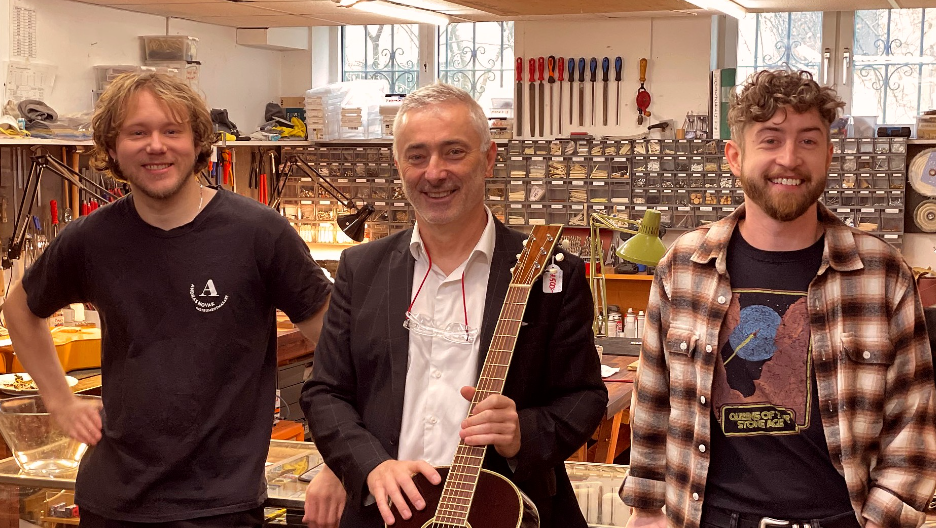 De vanligaste jobben i verkstaden handlar om service: strängbyten, justeringar, bandbyten och lagningar av sprickor eller brutna halsar. En specialitet är att reparera avbrutna Gibson-huvuden så skickligt att skadan blir osynlig.